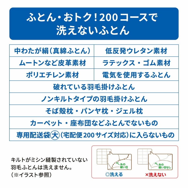 宅配便200サイズ対応専用配送袋のファスナーが閉まれば、ふとんを何枚でも入れていただけます。フレスコウォッシングシステムで、羽毛・羊毛・綿・ポリエステルなど素材別に中わたまで徹底クリーニング!一部洗えないふとんがありますので【ご注文前の注意事項】をお読みください。